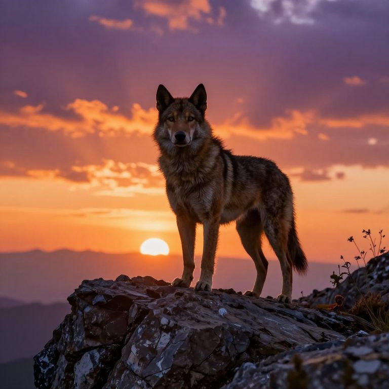 Photograph of a standing wolf with brown and black fur, alert and gazing directly at the camera. The wolf is positioned on a rocky outcrop, with its left front paw slightly raised. The background features a vibrant sunset, with the sun partially obscured by clouds. The sky is a blend of purple, orange, and pink hues, casting a warm glow over the scene. Small plants and rocks surround the wolf. The image has a sharp focus on the wolf, with a soft, dreamy effect on the sunset sky. The texture of the wolf's fur contrasts with the rough, jagged rocks.