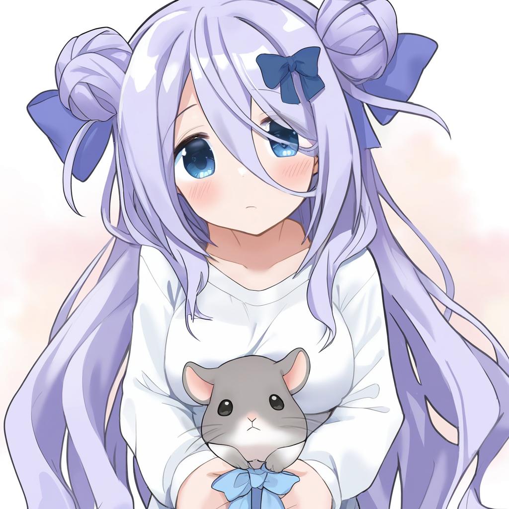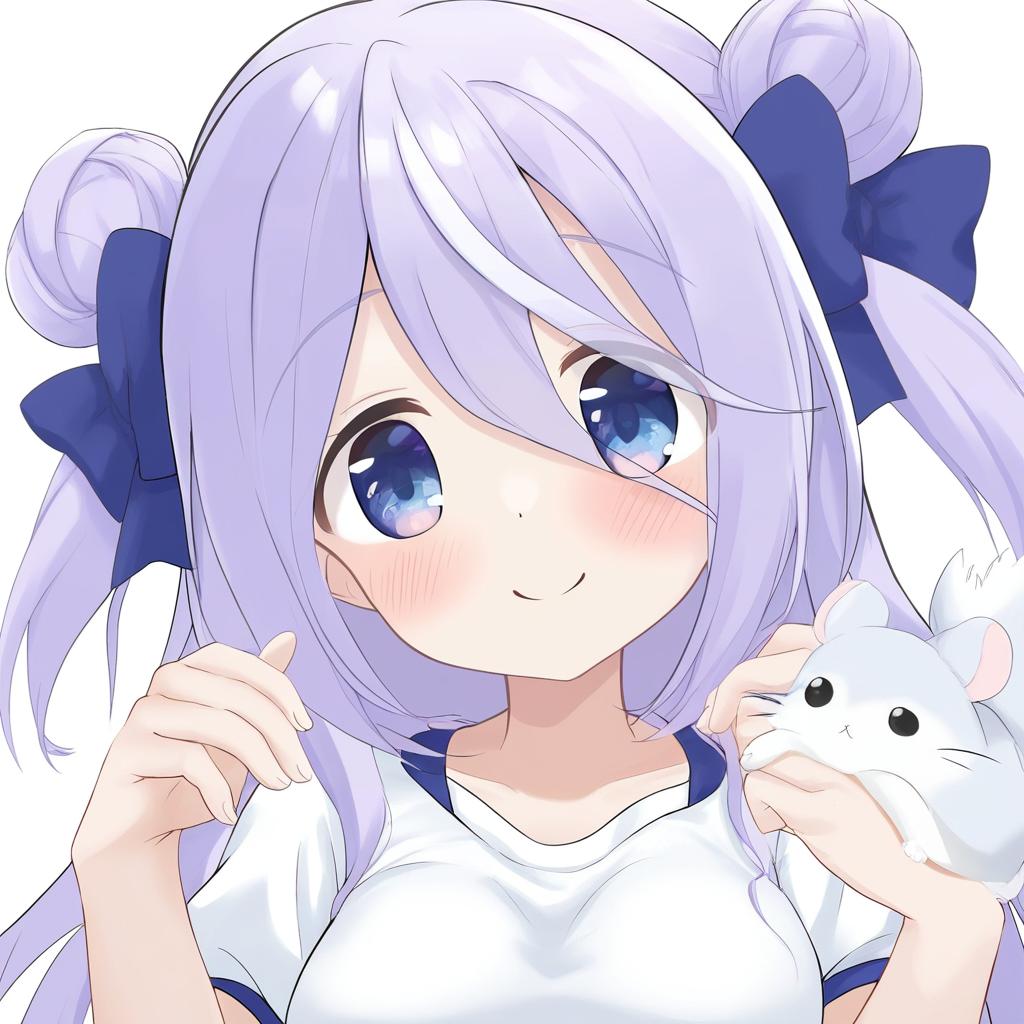 Amamiya shizuku (hizuki yayoi), original, 1girl, hair between eyes, blue eyes, purple eyes, purple hair, very long hair, blue hair, two side up, double bun, hair bow, medium breasts, collarbone, white shirt, blue bow, chinchilla (animal), animal, by artist oyatsu (mk2), leet