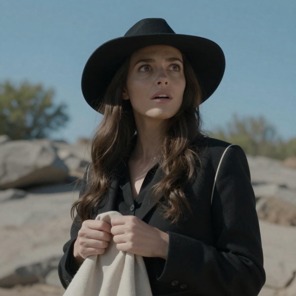 Woman with long brown hair, wearing a black hat and black jacket with white trim, looks up with a surprised expression. Bright blue sky background, rocky terrain, and green trees. She holds a beige cloth. Cinematic photograph.