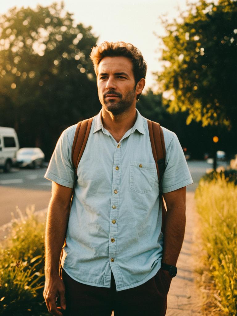 Man in Summer Casual Costume, photorealistic outdoor portrait, golden hour