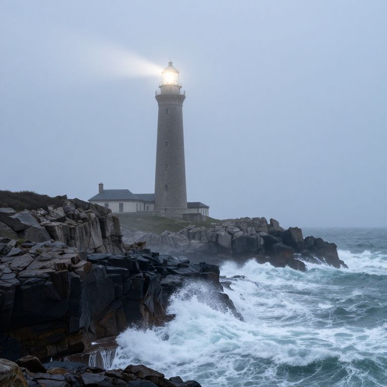 Photograph of a tall, gray stone lighthouse standing on a rocky coastline with turbulent, white-capped waves crashing against the rocks in the foreground. The lighthouse is illuminated by a bright light at its top, partially obscured by a misty, overcast sky. To the left of the lighthouse, there is a small, white, rectangular building with a dark roof. The rocks are dark, jagged, and textured, contrasting with the white foam of the waves. The scene is dramatic, with a sense of isolation and power, highlighting the lighthouse's role as a beacon in a stormy seascape.