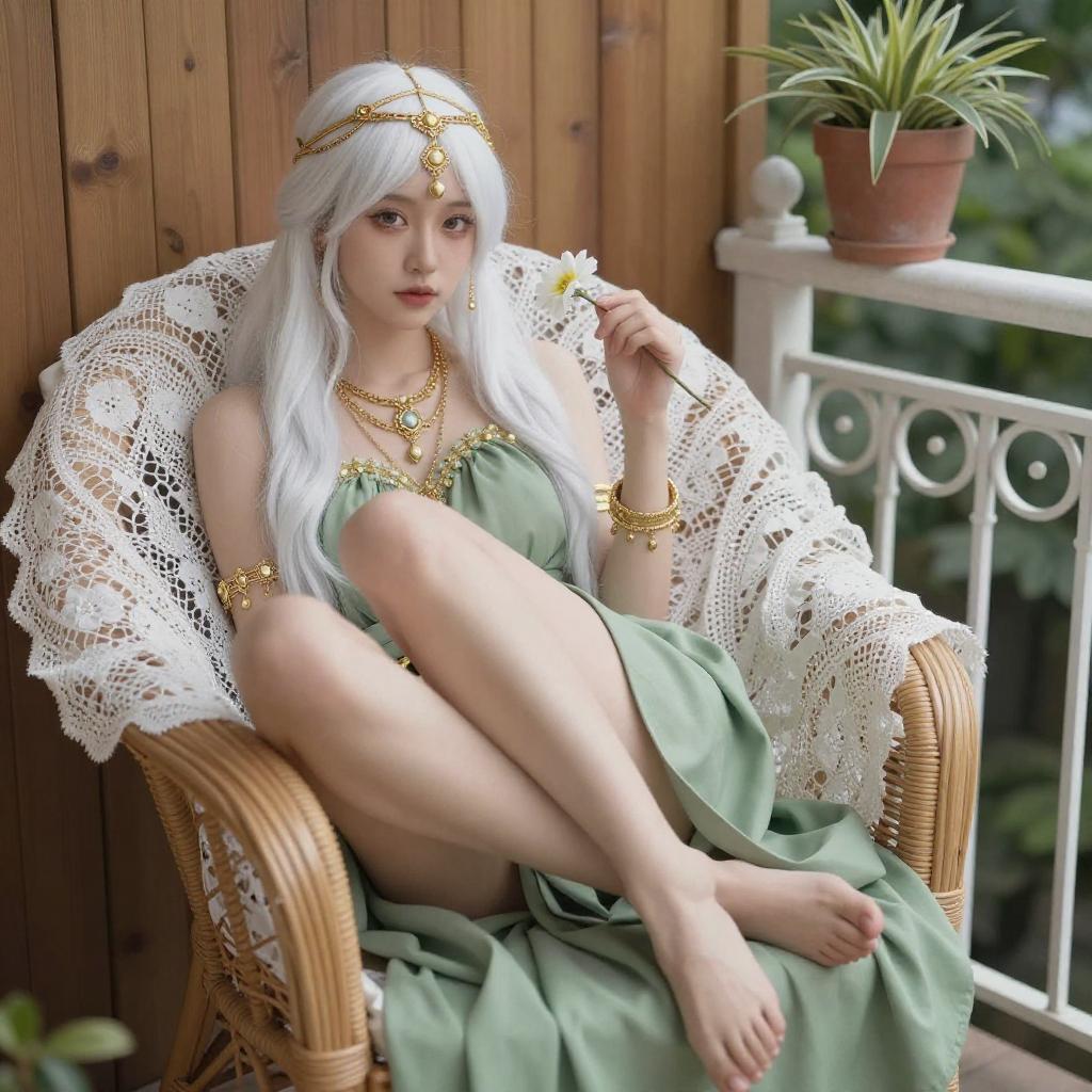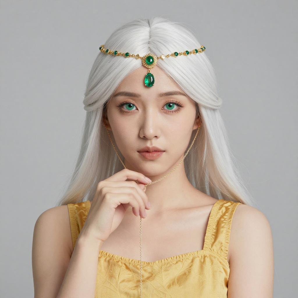 Photograph of an Asian woman with long, white hair, green eyes, and fair skin. She wears a gold headpiece with green gemstones and a yellow, sleeveless top. Her right hand is raised to her chin, displaying a delicate gold chain. The background is a plain, light gray.