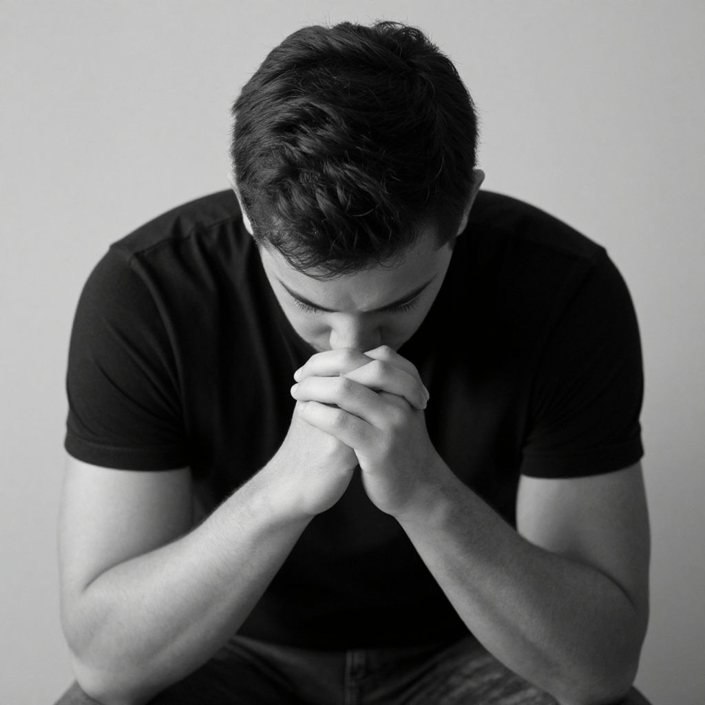 In a monochromatic embrace of introspection, the clasped hands and bowed head of a young man evoke a profound sense of serenity and contemplation, symbolizing the quiet strength of inner resolve amidst the weight of unseen burdens.