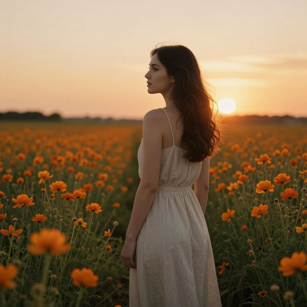 Bathed in the golden embrace of twilight, a woman stands amidst a sea of vibrant orange blooms, her gaze drifting toward the horizon, embodying a serene contemplation of freedom and the ephemeral beauty of life.
