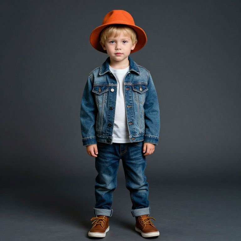 Photograph of a young blonde boy standing against a dark gray backdrop. He wears an orange wide-brimmed hat, a blue denim jacket over a white t-shirt, blue denim jeans, and brown lace-up shoes with white soles. His hands are by his sides, and he gazes directly at the camera with a neutral expression. The lighting is even, highlighting the textures of his clothing and the softness of his hair. The overall style is casual and modern.