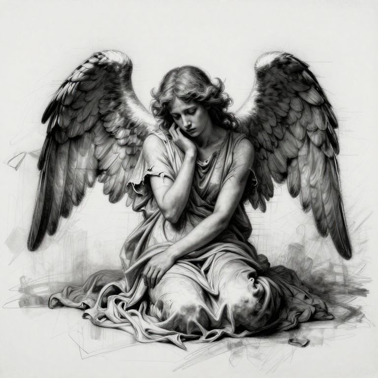 The image depicts a fallen angel in a melancholic pose, reminiscent of a Rembrandt charcoal sketch painting. The angel, adorned with intricate wings and a flowing, tattered garment, is seated against a stark, minimalist background. The artwork exhibits a blend of vibrant colors and textures, evoking a sense of depth and emotion. The angel's wings, detailed with fine brushstrokes, contrast sharply with the smooth, almost monochromatic background, creating a striking visual effect. The overall composition is balanced yet dynamic, with the angel positioned centrally, drawing the viewer's eye to the central figure. The interplay of light and shadow adds to the dramatic atmosphere, highlighting the angel's sorrowful expression and the tattered state of its garment. The image is a fusion of classical art techniques and modern glitch art elements, blending the past with the present in a visually captivating manner.