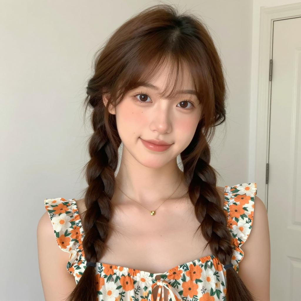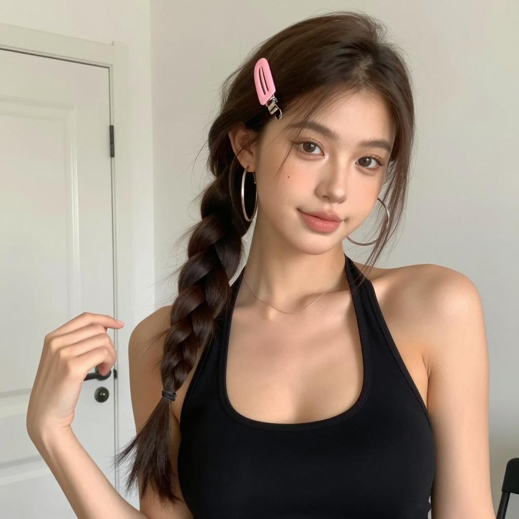Young woman with light blonde hair in braided sections, wearing a black cut-out top and a pearl necklace, takes a selfie. She has light skin, defined eyebrows, and neutral facial expression. Background includes a flat-screen TV, gray couch, and white walls. Modern indoor setting with a ceiling light. She is centered in the frame, looking slightly to the side.
