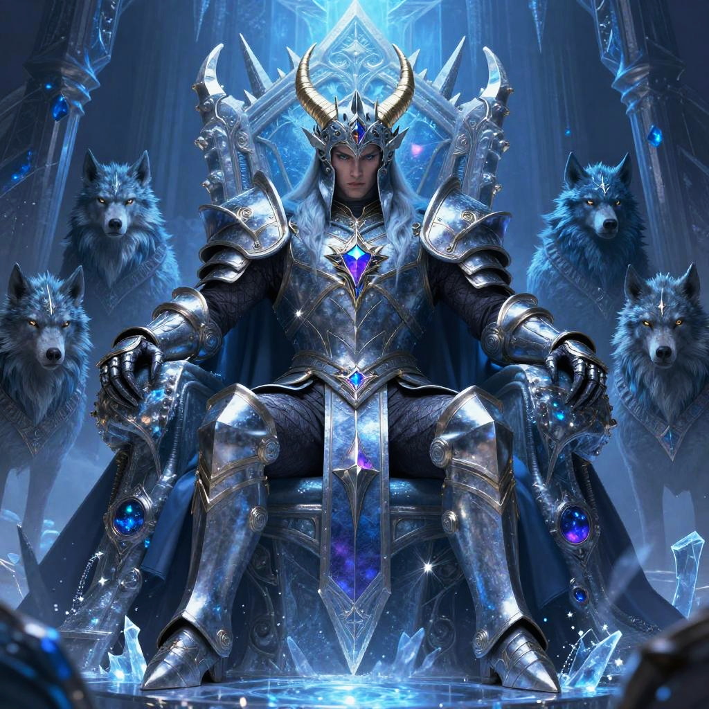 Lupus Overlord in a throne room carved from ice and stone, surrounded by loyal wolf warriors, cold blue and purple hues, intricate medieval fantasy armor, intense gaze, powerful and regal presence, art by fantasy illustrators, ultra detailed and dynamic composition