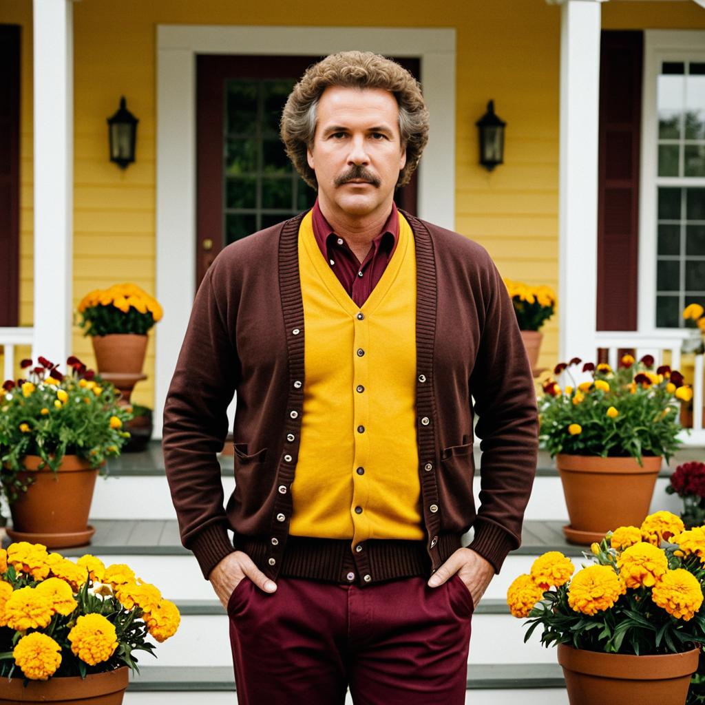 Funny will ferrell costume, photograph of a middle-aged man with curly brown hair and a mustache, wearing a brown long-sleeve cardigan with maroon trim, yellow shirt, and brown pants, standing in front of a yellow house with potted plants and marigolds, daytime, serious expression, realistic style, outdoor setting, colorful background, symmetrical composition