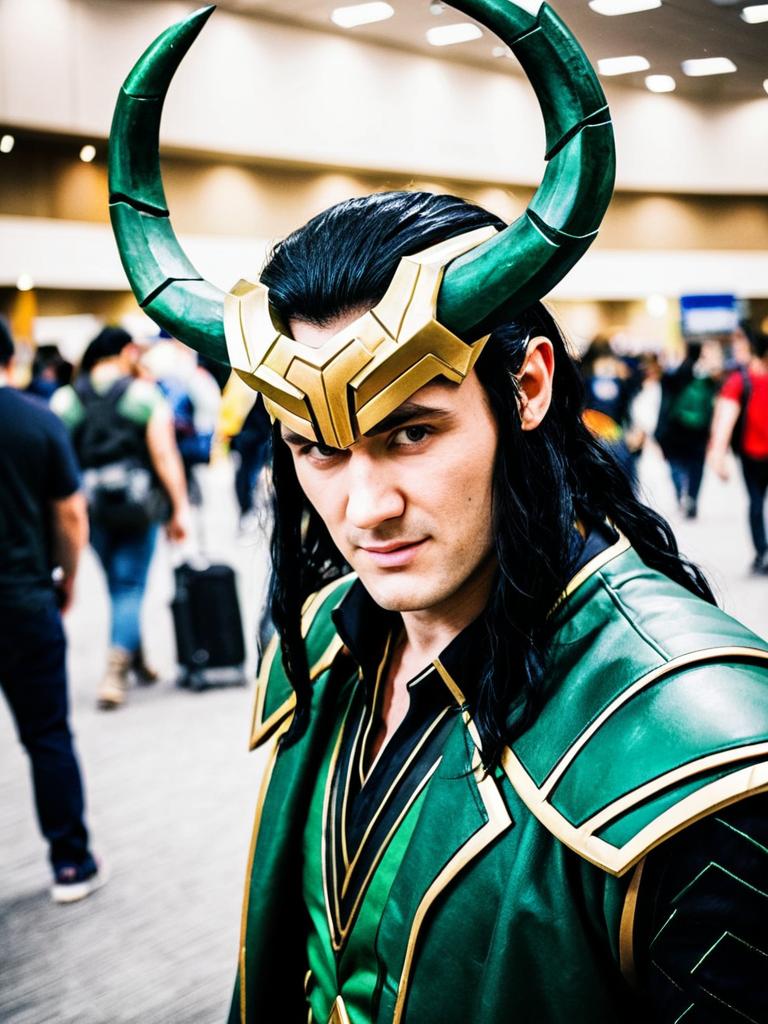 Man in Loki Ragnarok Cosplay, candid cosplay portrait at comic convention