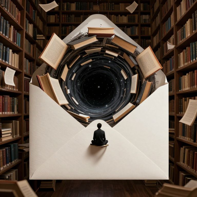 Photograph of a person sitting on a white floor in a library, viewed from above. The individual is silhouetted against a large, open, white envelope-shaped hole in the center of the image, surrounded by concentric black circles. Bookshelves filled with books line both sides of the library, and scattered open books float around the hole. The background is dark, with the library shelves extending into the distance. The image has a surreal, conceptual style, blending real and imagined elements. The person is centered, with the hole and books creating a dramatic, dreamlike atmosphere.
