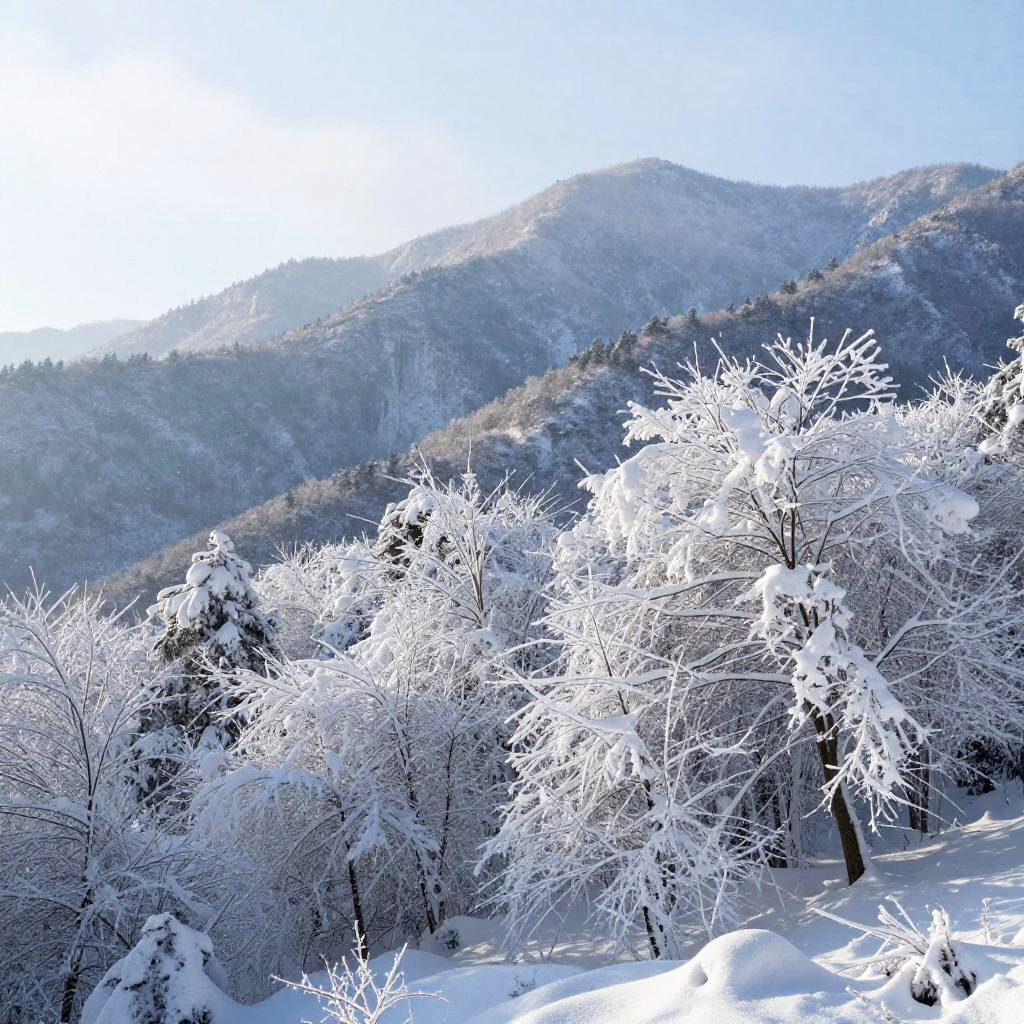 Add snow to photo of a serene mountain landscape at dawn, delicate snowflakes descending gently, soft white blanket covering trees and ground, cool blue and white tones, crisp and peaceful winter atmosphere, high resolution detail.