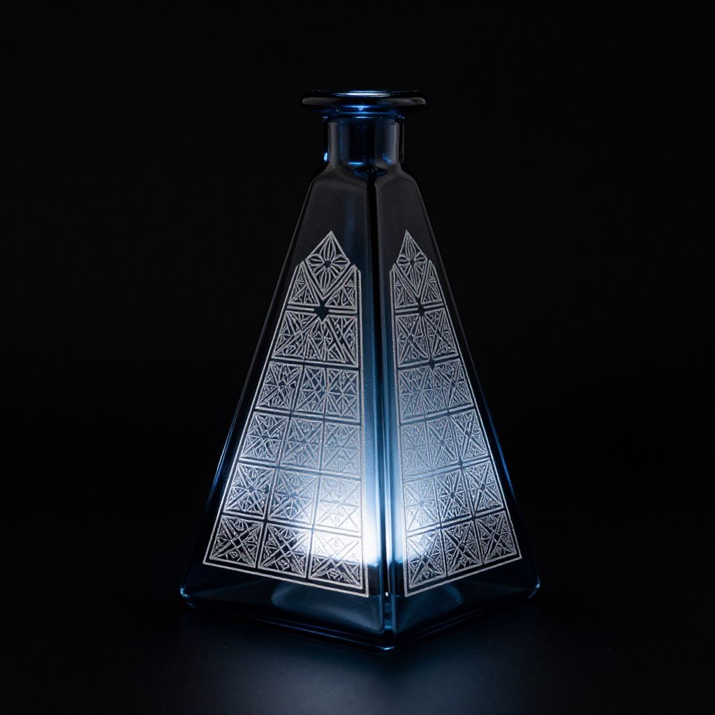 Photograph of a translucent, blue-lit triangular glass bottle with intricate white geometric patterns against a black background.