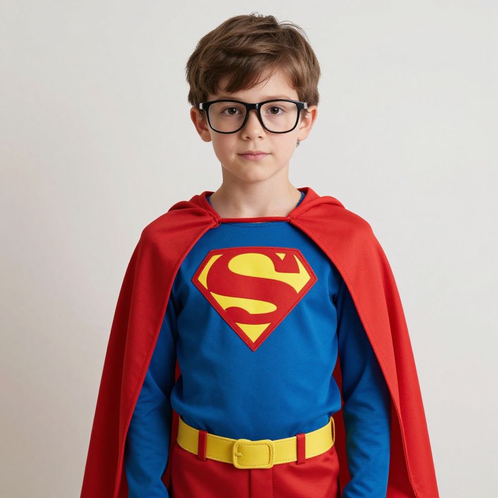 Photograph of a young boy with short brown hair and black-framed glasses, standing against a plain white background. He is dressed as Superman, wearing a red cape, blue shirt with a large yellow and red "S" emblem on the chest, and red pants with a yellow belt. His expression is neutral, and the lighting is even, highlighting the bright colors of his costume. The image has a clean, studio-like quality, focusing on the boy from the waist up.