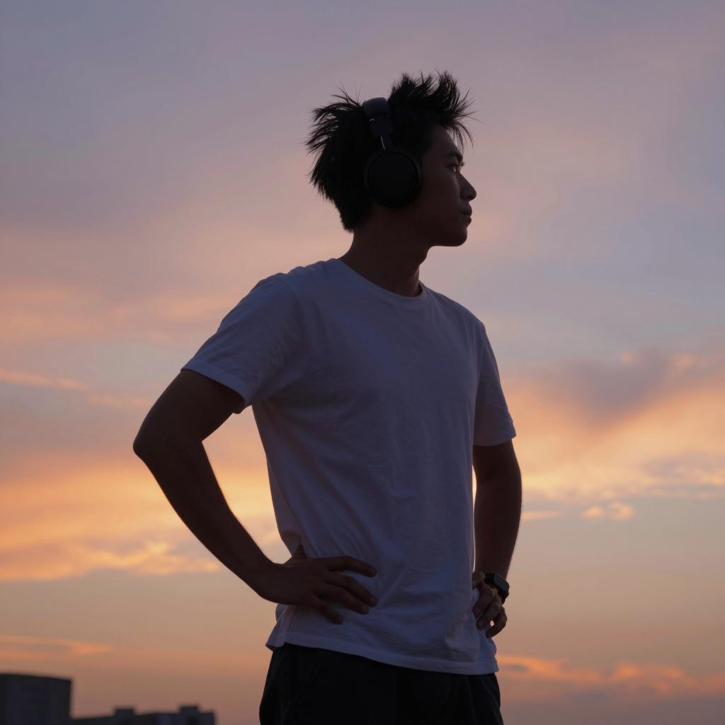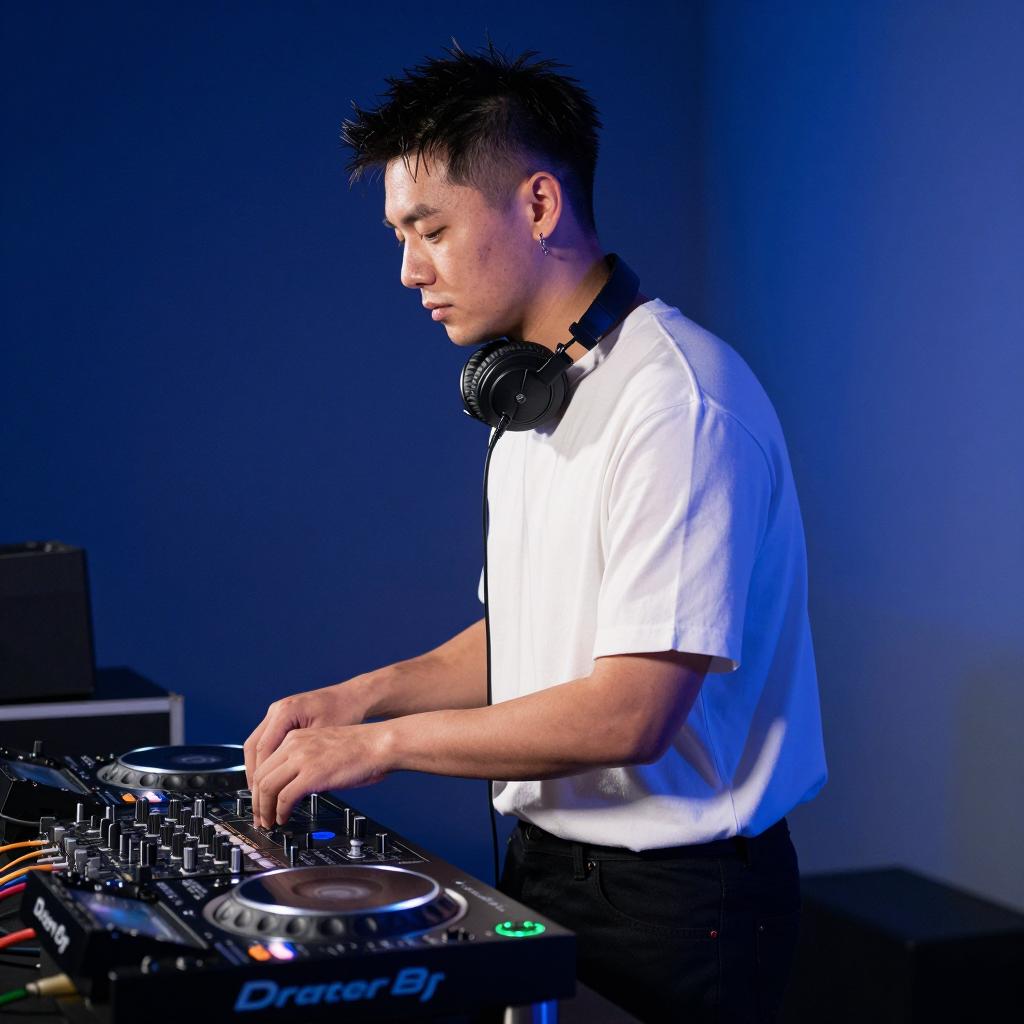 Male DJ with short, spiky hair and white shirt, standing behind DJ console, leaning slightly forward, looking to the left. Blue lighting illuminates the scene. Right side of image has a ured blue gradient. DJ wears black pants and headphones hang around his neck.