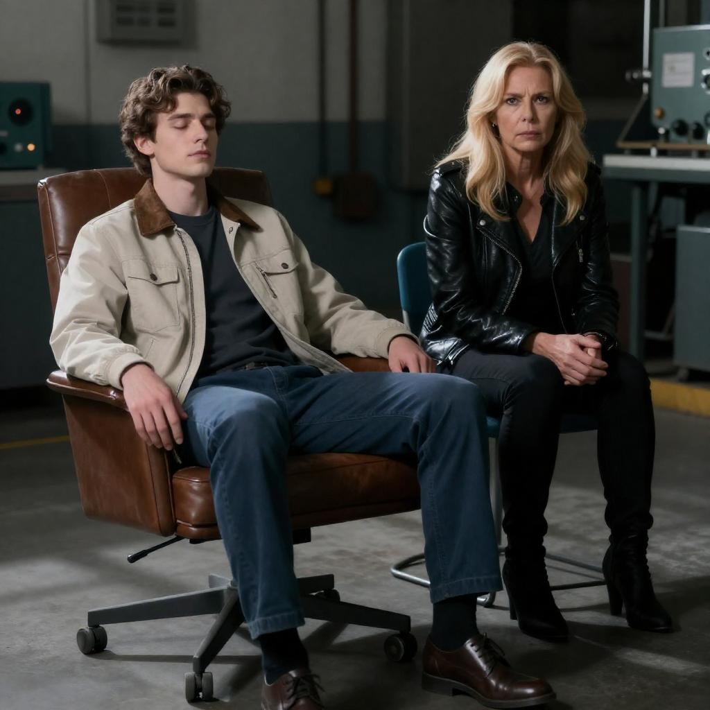 A young man with curly brown hair wearing a green military-style jacket and teal shirt sits in an airplane seat looking serious. Next to him, a blonde woman with wavy hair dressed in a tan jacket and patterned blouse sits with eyes closed, holding a white cup. Both are seated on dark blue upholstered seats inside the airplane cabin.