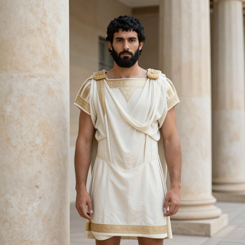 Photograph of a dark-haired, bearded man with a medium build, standing in a classical, columned hall. He wears a white, ancient Greek-style tunic with gold trim and shoulder straps. His expression is serious, with intense brown eyes looking directly at the camera. The background features beige stone columns and a partially visible doorway. The lighting is natural, highlighting the texture of the stone and the fabric of his tunic. The overall style evokes ancient Roman or Greek architecture.