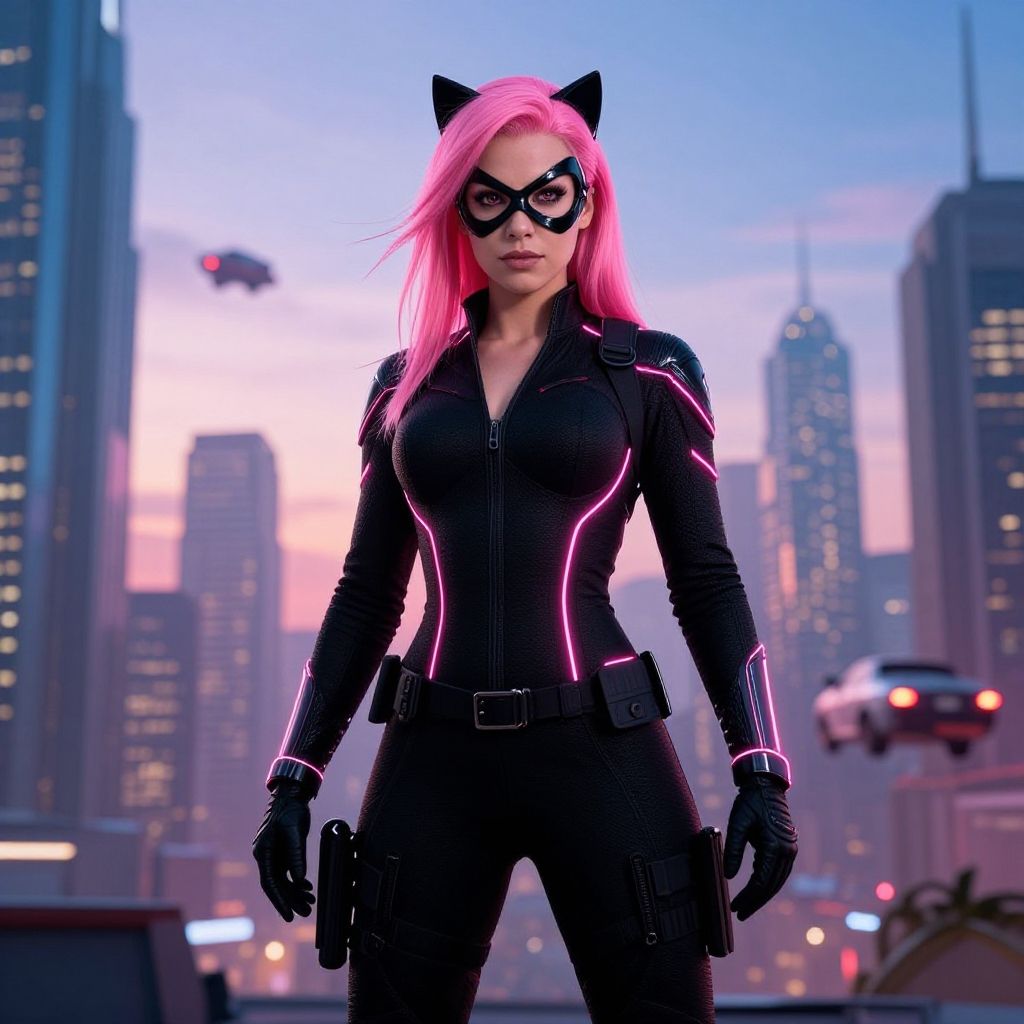 Catwoman sporting a vivid pink wig, standing confidently in a futuristic metropolis at dusk, wearing a tactical suit with glowing pink trims, cityscape with towering skyscrapers and flying cars, dramatic lighting creating a heroic mood