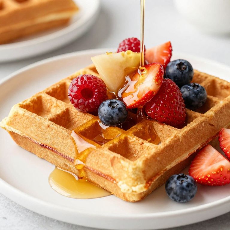 Golden-brown rye waffles, stacked in a three-quarter angle, are generously topped with vibrant red strawberries, plump blueberries, and cascading maple syrup that pools invitingly around the edges on a pristine white plate.