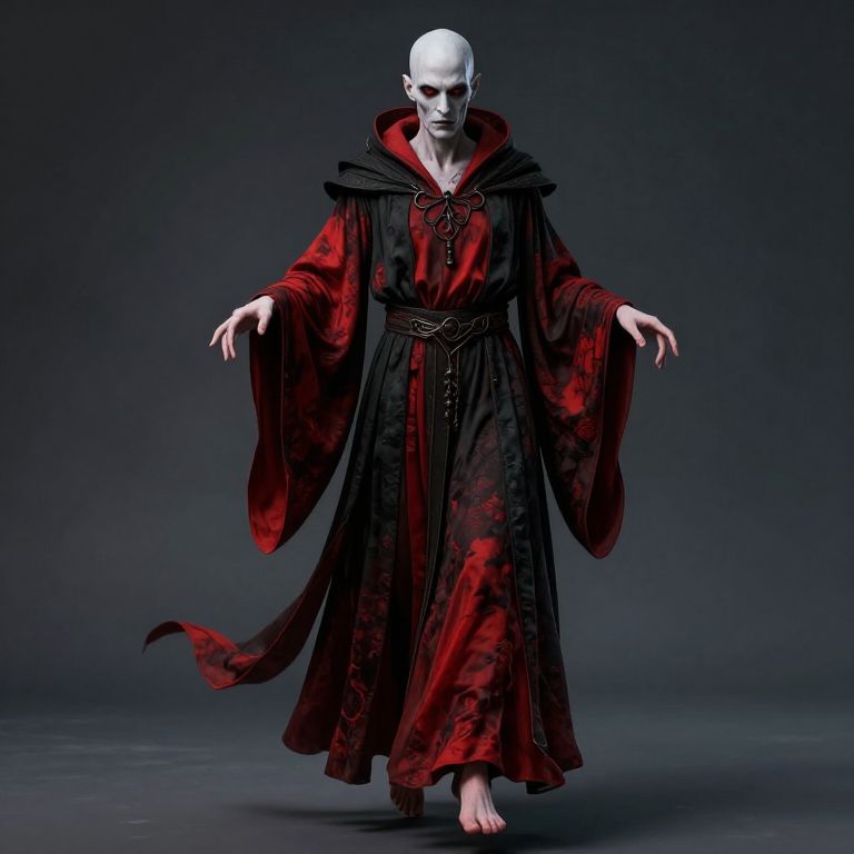 CGI image of a bald, white-skinned, skeletal figure in a flowing black and red robe, standing against a dark blue background with arms out
