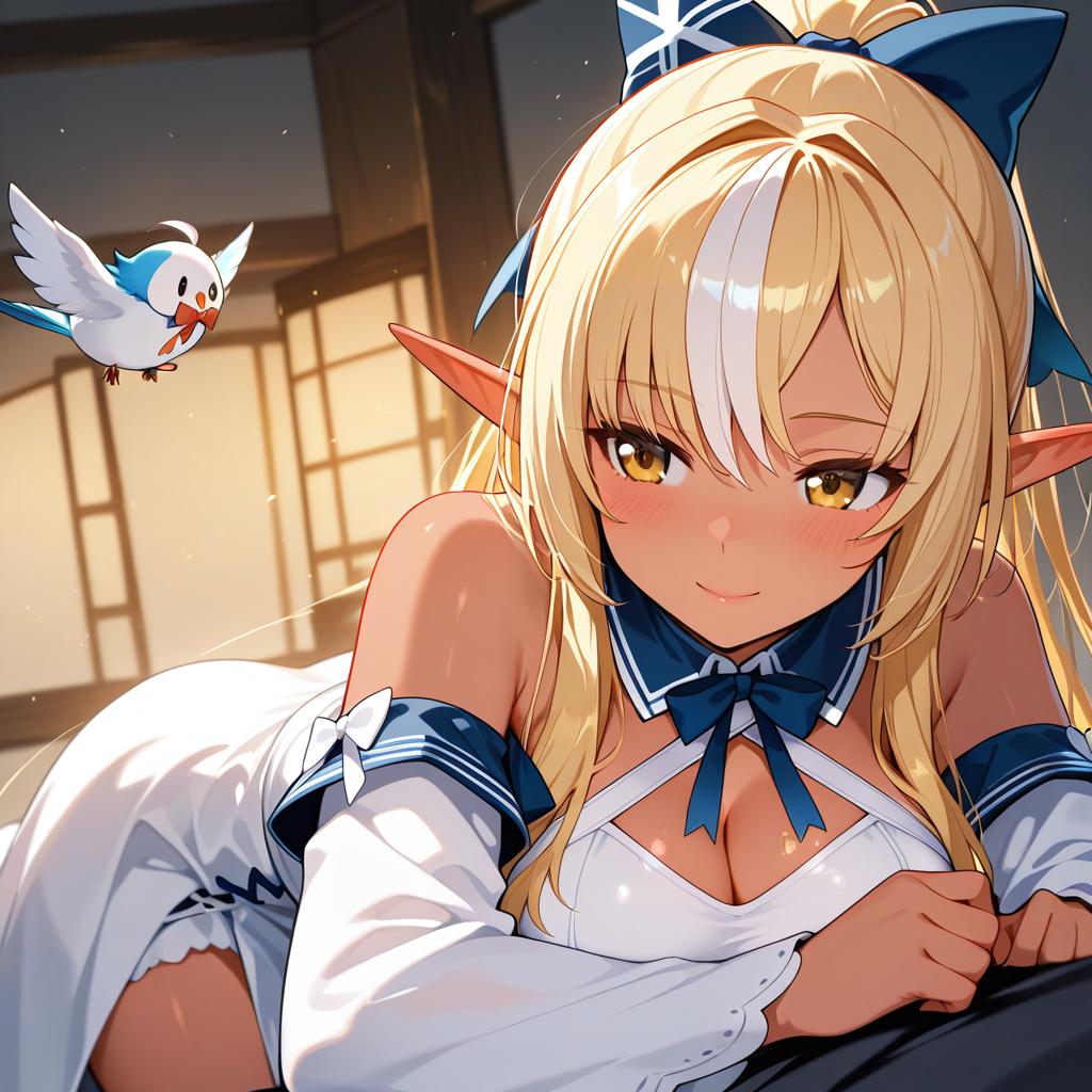 Digital illustration of a dark-skinned female anime elf character with long blonde and white streaked hair tied in a high ponytail with a blue bow. She has large amber-orange eyes and pointed elf ears. The character wears a white dress with blue bows, detached long sleeves, and showcases a confident expression with slight blush. A small bird is flying nearby in a softly lit, traditional Japanese-style interior.