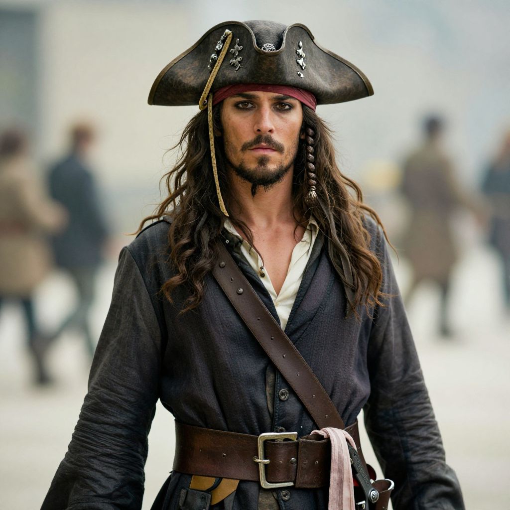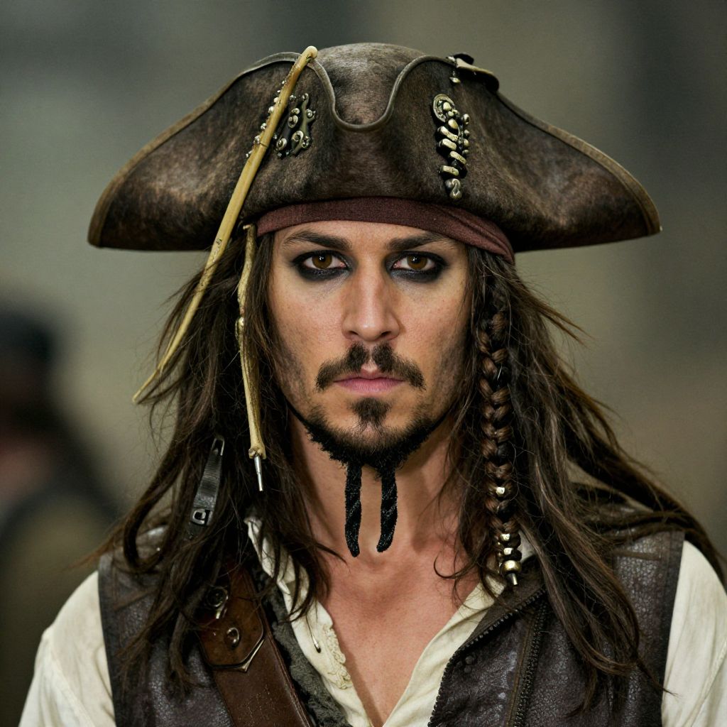 "pirate costume makeup, 1boy, pirate hat, solo, male focus, hat, pirate, looking at viewer, blurry, blurry background, facial hair, bicorne, brown eyes, brown hair, closed mouth, portrait, long hair, mustache Realistic photo of casual sexy person with pretty face"