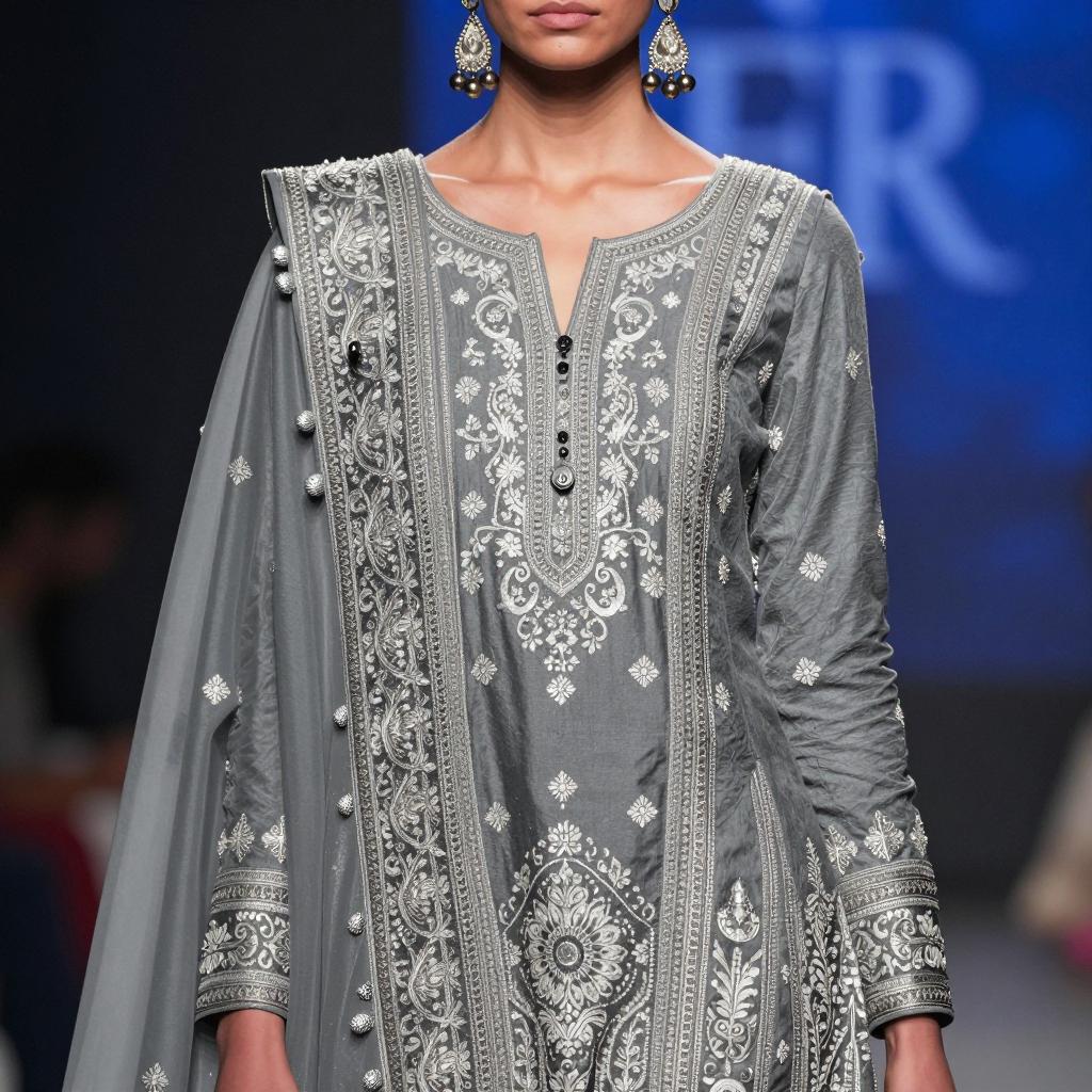Charcoal punjabi fashion runway, closeup on traditional model, intricate textile details, beautiful patterns, royalty, maharaja, triadic color scheme, bokeh, canon 5d mark ii, 50mm f/1.2, blue volumetric background light, after the rain, intricate 8k, ultra detailed, brilliant white, realistic, soft lighting, intricate details, beautifully color graded, Unreal Engine, Cinematic , Color Grading, Photography, Photoshoot, Shot on 85mm lens, f1.2, Depth of Field, DOF, 32k, Super-Resolution, Megapixel, Backlight, Natural Lighting, Incandescent, Optical Fiber, Studio Lighting, Soft Lighting, Volumetric, Conte-Jour, Beautiful Lighting, Accent Lighting, Global Illumination, Screen Space Global Illumination, Ray Tracing Global Illumination, Optics, Scattering, Glowing, Shadows, Rough, Shimmering, Ray Tracing Reflections, Lumen Reflections, Screen Space Reflections, Diffraction Grading, Chromatic Aberration, GB Displacement, Scan Lines, Ray Tracing Ambient Occlusi on, Anti-Aliasing, FKAA, TXAA, RTX, SSAO, Shaders, OpenGL-Shaders, GLSL-Shaders, Post Processing, Post-Production, Cell Shading, Tone Mapping, CGI, VFX, SFX, insanely detailed and intricate , hyper maximalist , elegant, hyper realistic, super detailed, dynamic pose, Hyper realistic, volumetric, photorealistic, ultra photoreal,