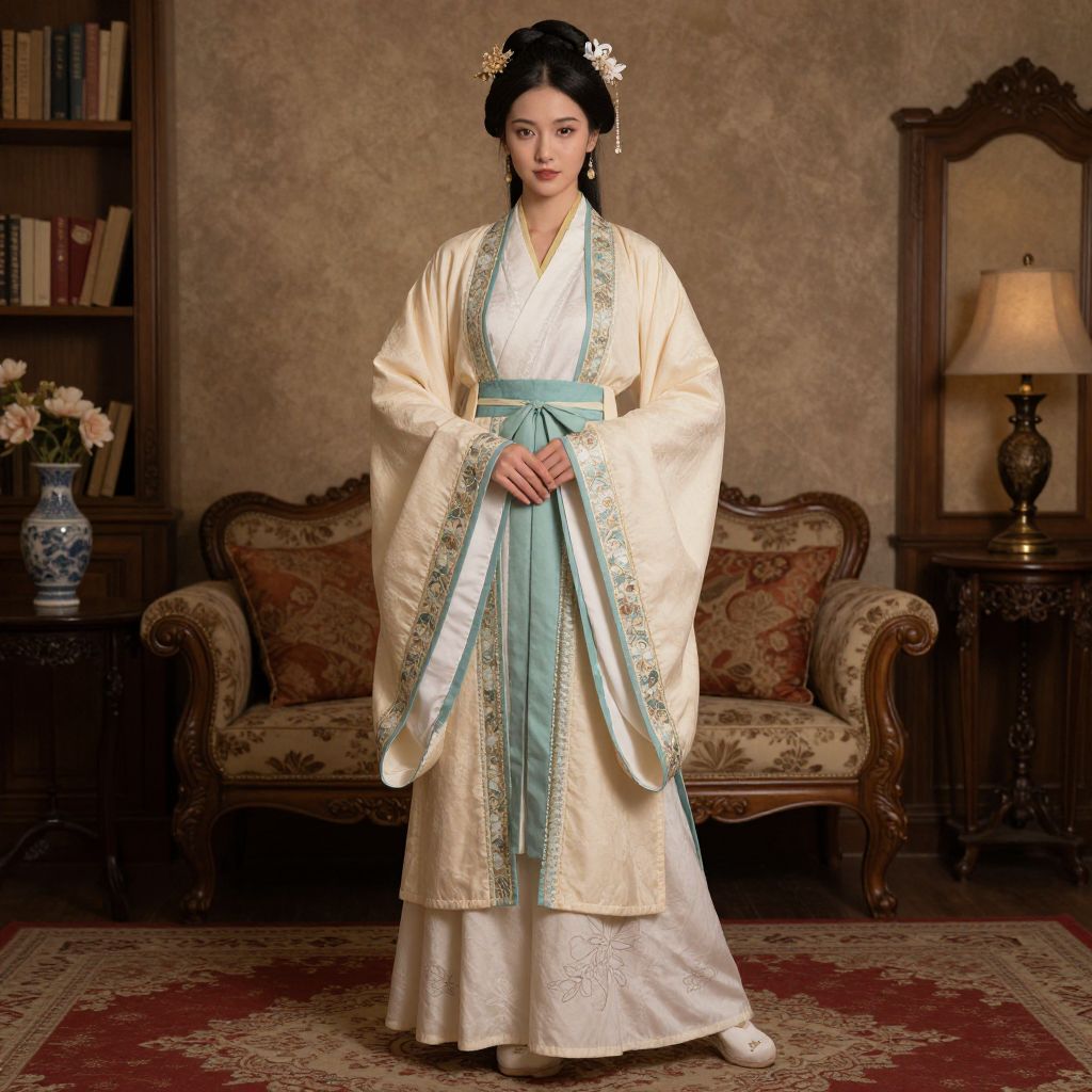 Photograph of an East Asian woman standing in an opulent, traditional-style room. She has fair skin, black hair adorned with floral hairpins, and wears a cream-colored, silk hanbok with light blue and green embroidered trim, a matching obi belt, and white shoes. She stands in front of a patterned, upholstered sofa with wooden arms, flanked by a wooden bookshelf with books and a blue vase, and an ornate table lamp with a beige shade. The background features a textured, beige wall and a red patterned rug. Her expression is calm and poised.