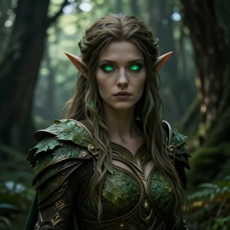 Digital artwork of a green-eyed, elven woman with long brown hair and pointed ears, wearing intricate green and gold armor, standing in a dense,