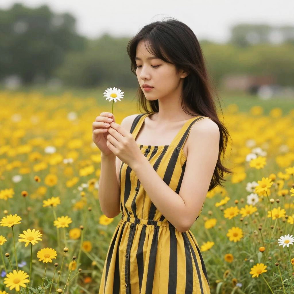 A young woman stands in a vibrant field of yellow flowers, holding a single white daisy delicately between her fingers. She wears a stylish yellow and black striped sleeveless dress, blending harmoniously with the bright natural backdrop under soft daylight.