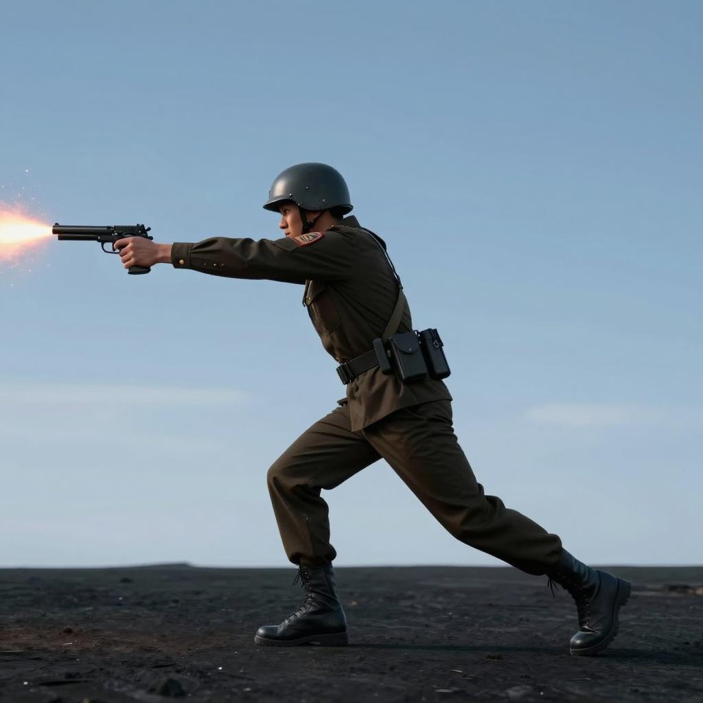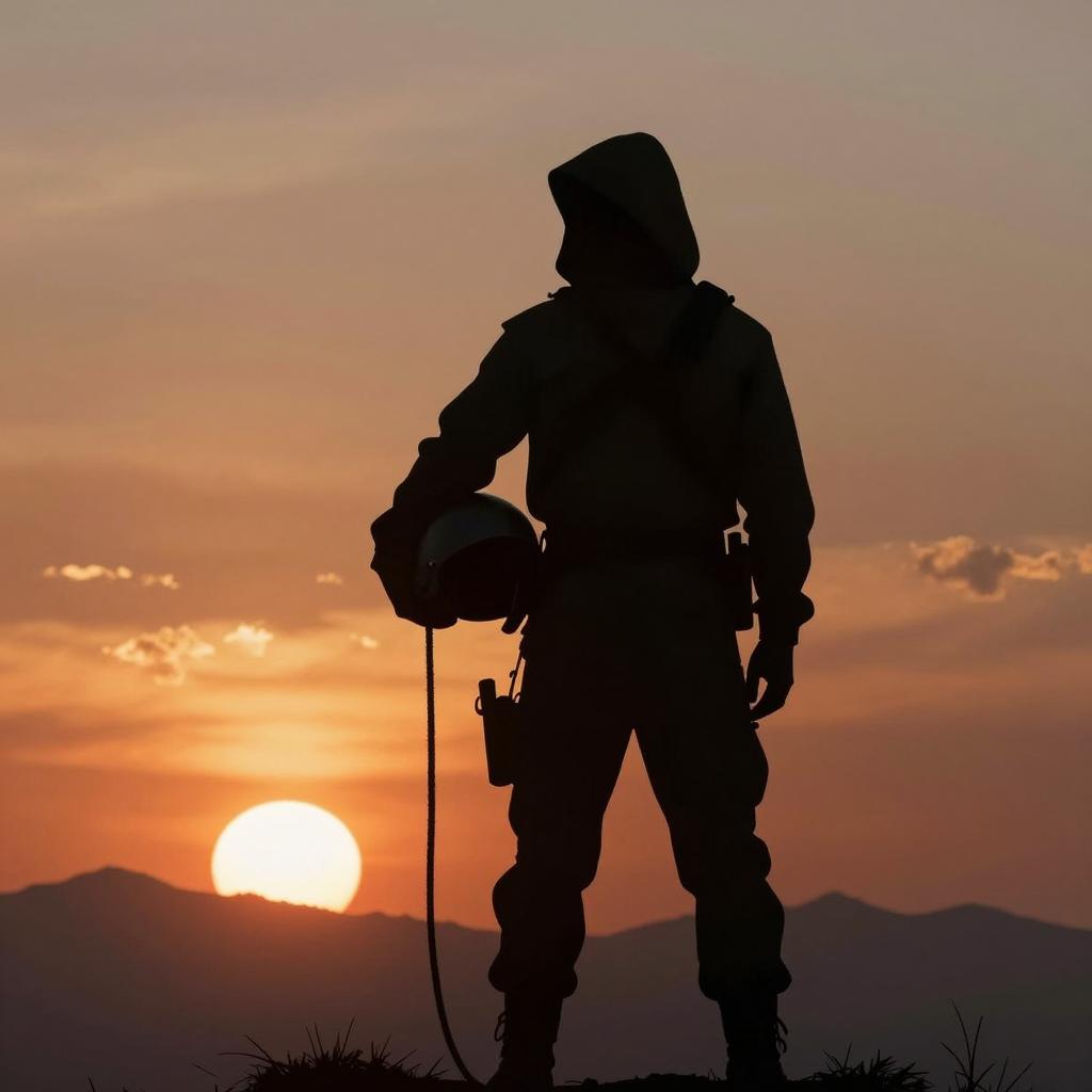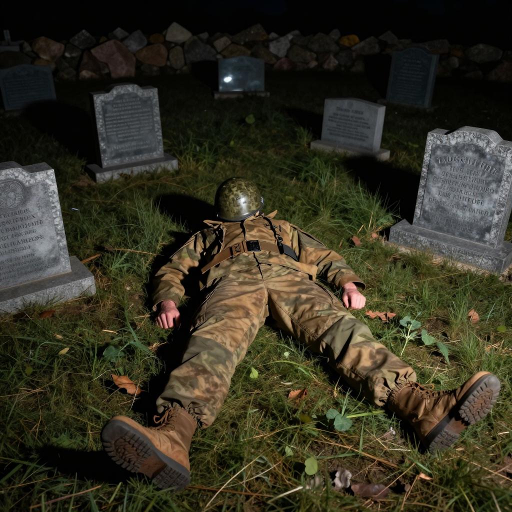 Photograph of a soldier lying on grassy ground at night, surrounded by five gravestones, legs splayed out, helmet askew, in a dark, rocky cemetery. Soldier's face is not visible. Grave markers are scattered around him.