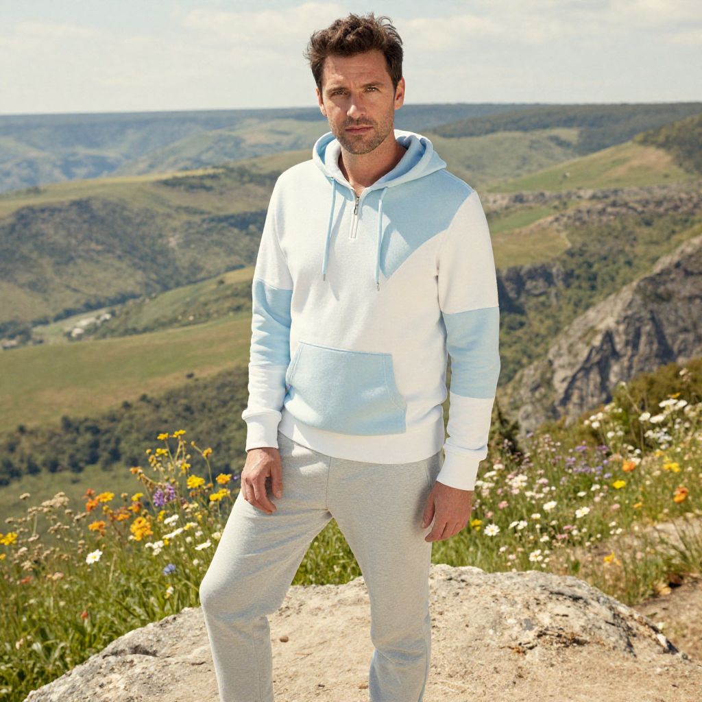 A man, lightweight zip-up hoodie in pastel blue and white, tapered sweatpants in light gray, casual and comfortable, rocky outcrop viewpoint, sweeping valley below, vibrant wildflowers, hand-tinted photograph, relaxed expression. Man has masculine face and piercing eyes