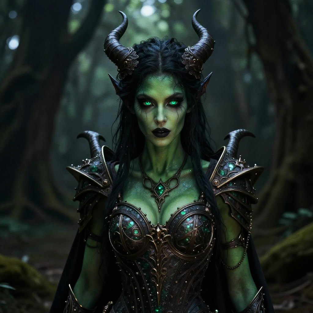 Succubus green color, fierce and captivating green-skinned succubus, sharp horns and tail, wearing ornate armor with glowing green gemstones, standing in enchanted swamp, detailed textures