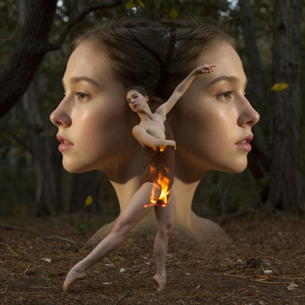 Photographic surrealism: small nude ballerina with fire pose between two large, mirrored female faces in forest, dark trees in background.
