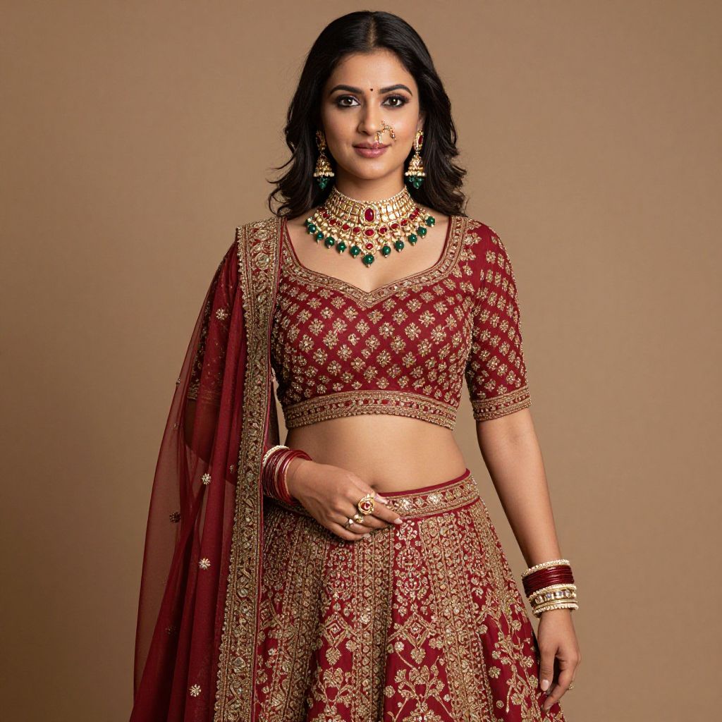 Photograph of a young South Asian woman with medium brown skin and long black hair, wearing a traditional red and gold traditional lehenga-choli set. Her top is a short-sleeved, cropped choli adorned with intricate gold embroidery, and the matching skirt is a full, pleated lehenga. She accessorizes with a large, ornate green and gold necklace, matching earrings, and gold bangles on both wrists. Her right hand rests on her hip, and her left hand is slightly lowered. The background is a plain, beige color, highlighting her elegant and elaborate attire. Her makeup is subtle, with a focus on her dark eyes and lips.