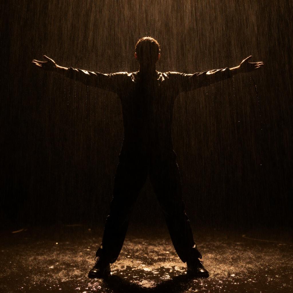 Silhouetted figure in the center, arms outstretched, standing in rain. Golden light from above illuminates figure, creating dramatic contrast. Dark, rainy background. Figure wears dark, ured clothing. Raindrops visible. Intense, dynamic pose. Single person.