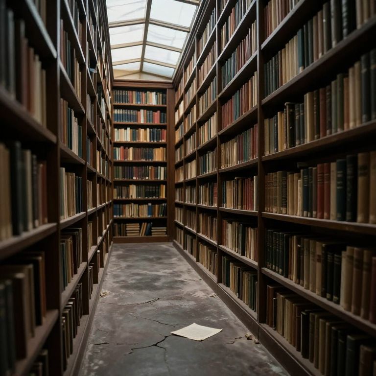 Rows of towering bookshelves line a dimly lit corridor, their aged spines casting shadows beneath a translucent skylight, while a solitary piece of paper rests on the cracked, stained floor, hinting at forgotten tales within this atmospheric library.
