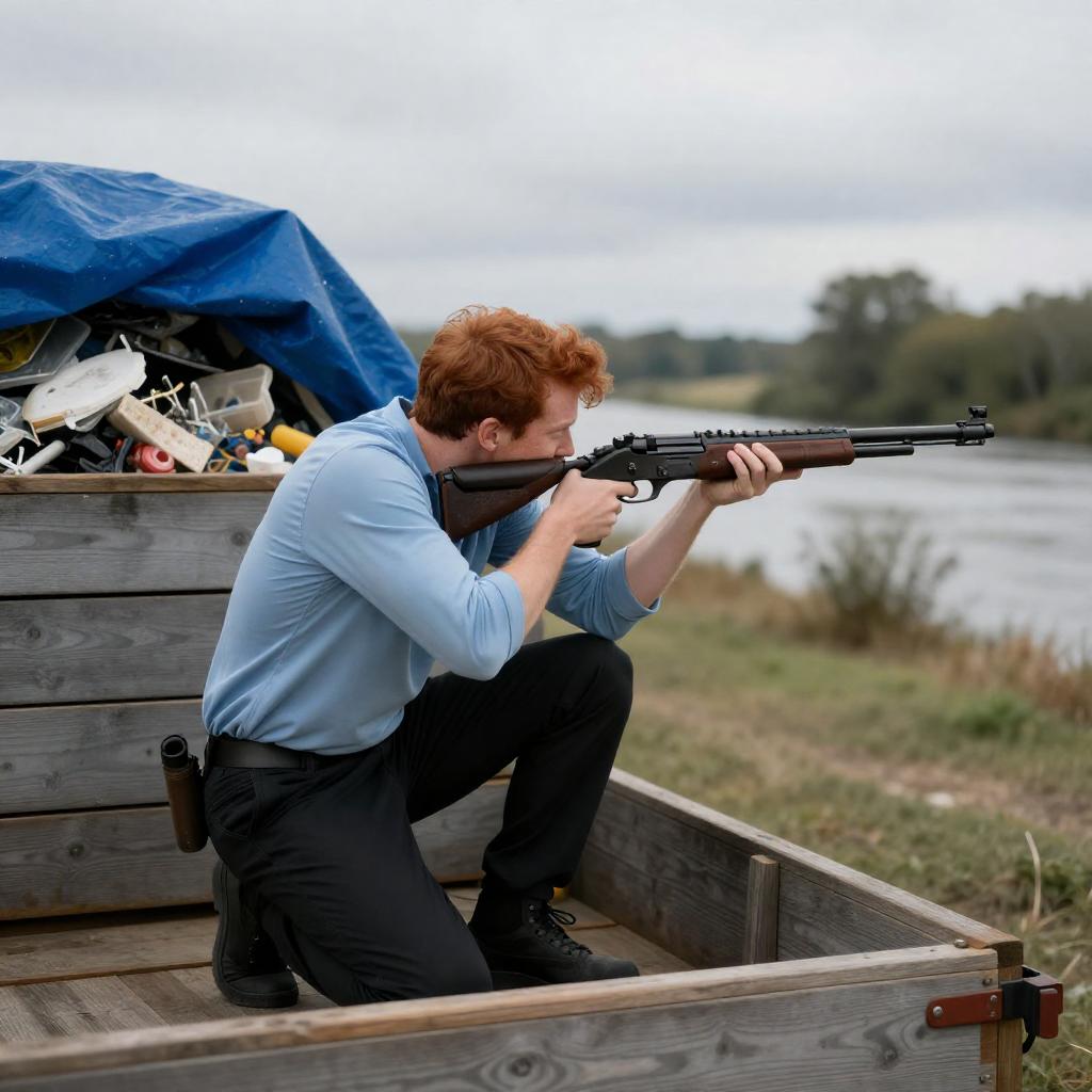 Photograph of a man with short red hair, wearing a light blue button-up shirt, holding a black assault rifle with both hands. He stands in a metallic, industrial-looking building with vertical metal panels in the background. His facial expression is intense and focused. The bottom of a dark brown helmet is visible in the foreground, slightly blurred. The man is centered in the frame.