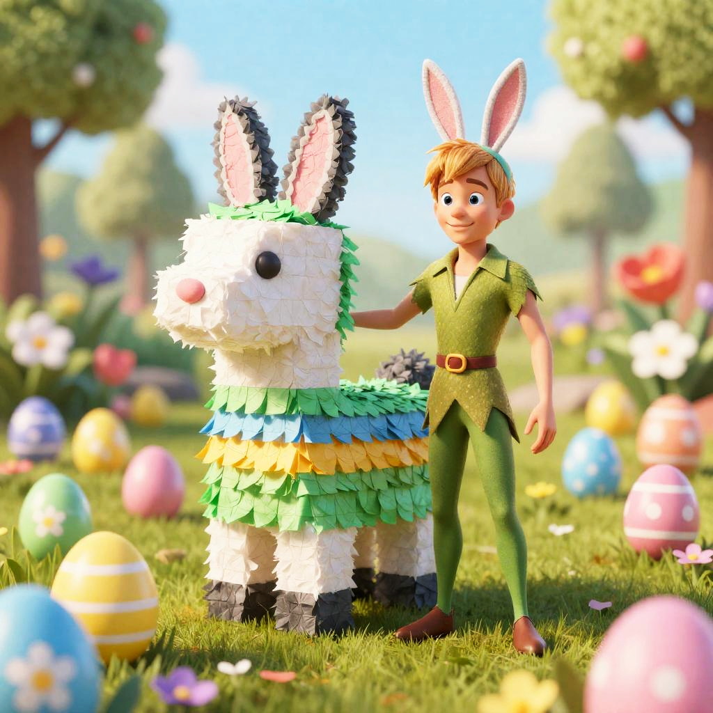 Realistic photo.Easter scene in Germany, colorful garden filled with painted Easter eggs, with a 22-year-old bisexual slim German man dressed as Peter Pan with bunny ears, standing next to giant Easter egg piñata, ultra-high detail, Disney style, Unreal Engine, 3D realistic photo