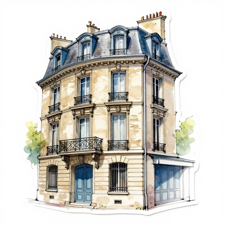 Colorful, detailed watercolor drawing of a classic French-style, three-story townhouse with ornate balconies, arched windows, and a slate