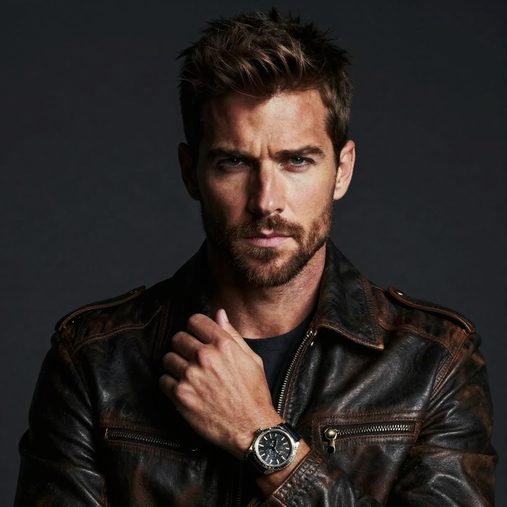 Masculine aesthetic portrait of a rugged man with chiseled features, strong jawline, wearing a leather jacket and watch, dark moody background, cinematic lighting