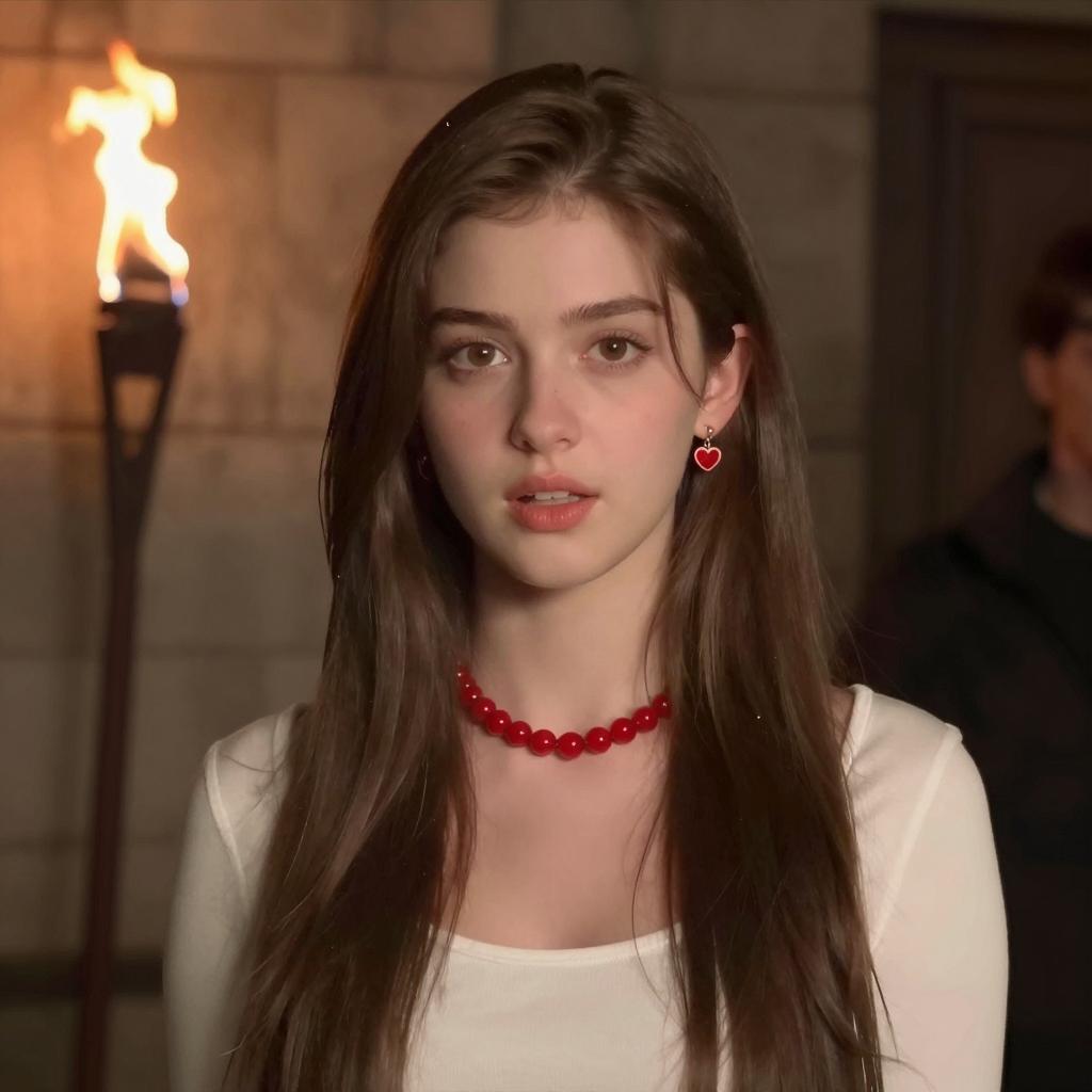 Photograph of a young woman with short brown hair, wearing a red and brown sleeveless dress, necklace, sitting in a dimly lit room. She has a serious expression, looking slightly to the right. Dark background with faint light sources.