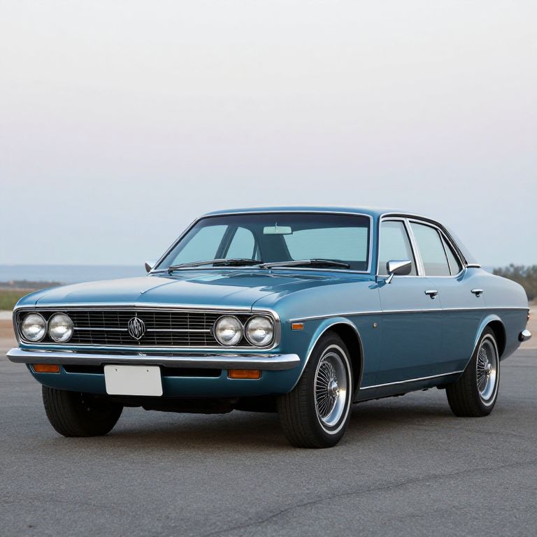 Photograph of a classic, teal-blue Volkswagen fastback with a black grille and round headlights. The car has chrome trim, wire-spoke wheels, and a white license plate. It's positioned slightly angled to the right, on a paved surface with a blurred, open landscape in the background. The sky is overcast, giving a soft light to the scene. The car's smooth, shiny surface reflects light, highlighting its vintage design and well-maintained condition.