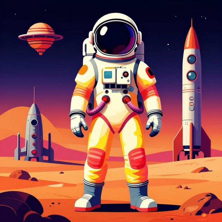 Vibrant digital illustration of an astronaut in a white spacesuit with red accents, standing on a red-orange Martian landscape with a rocket, satellite,