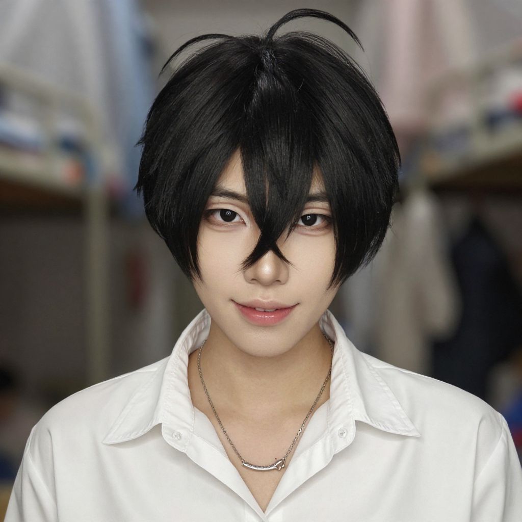 Photorealistic digital portrait of an androgynous young person with black, messy hair, wearing a white shirt and silver chain, smiling subtly.