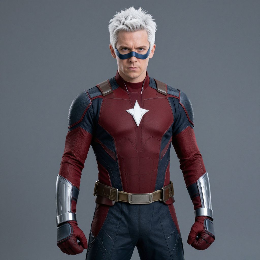 Avengers quicksilver costume, 1boy, male focus, solo, white hair, armor, belt, standing, mask