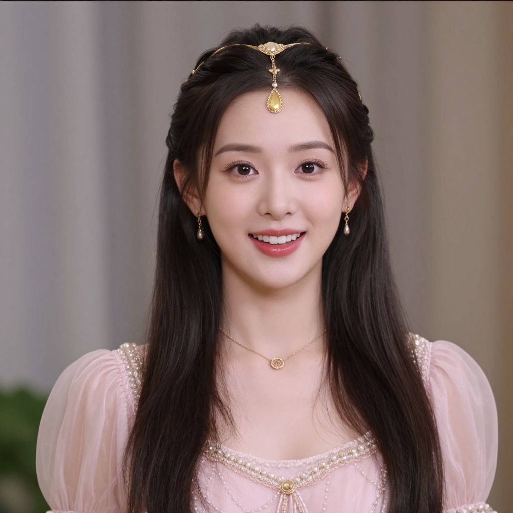 Photograph of an East Asian woman with long black hair, wearing a pink, beaded dress and gold headpiece, smiling softly. Background: blurred