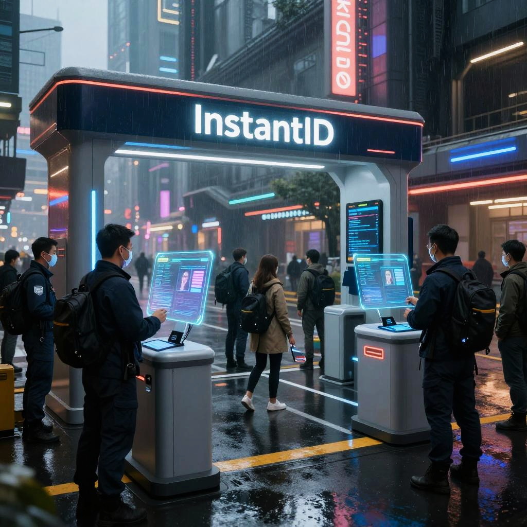 Photograph of a rainy urban night scene with neon lights, people in raincoats using touchscreen kiosks at an "InstantD" booth in