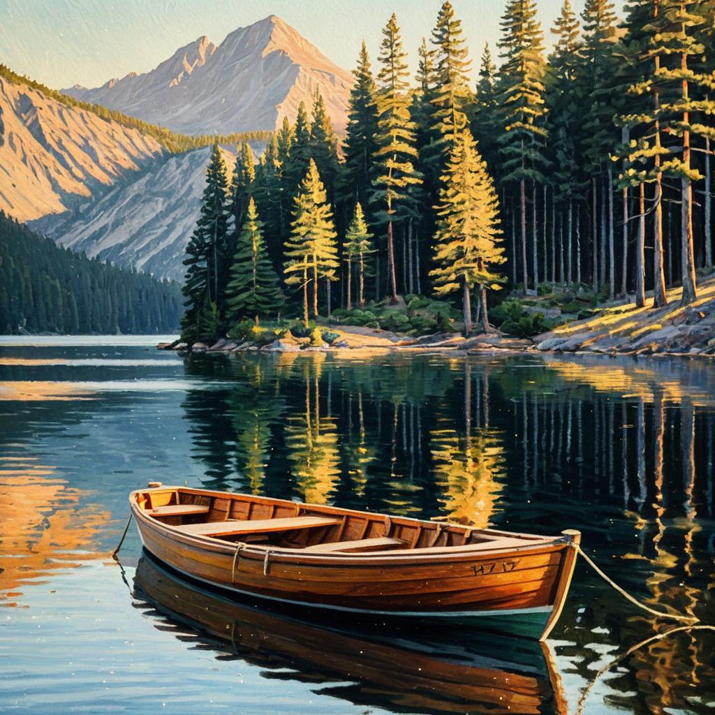 A serene mountain lake with a wooden boat floating on calm water, golden hour sunlight filtering through pine trees and sparkling water reflections, rendered in impressionist pastel sketch.