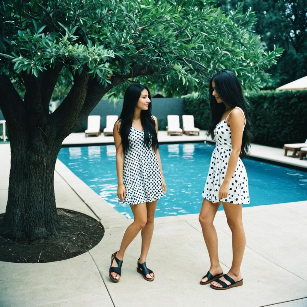 Two young women with long black hair wearing white polka dot dresses and sandals standing by an outdoor swimming pool near a large tree. The setting is serene with lounge chairs and greenery in the background, suggesting a relaxing poolside environment.